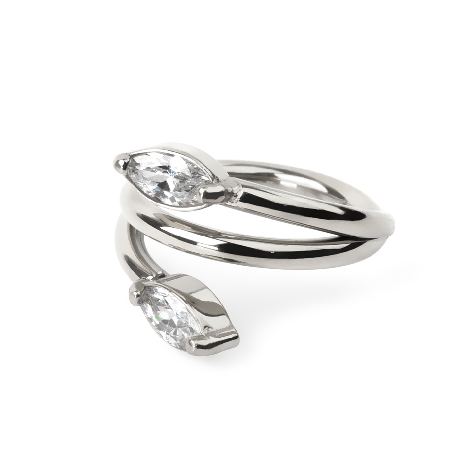 Delikatne kółko ze stali chirurgicznej zamykane zawiasem. To piękne kółko zdobione jest dwoma kamieniami o szlifie markizy, które przypominają liście winorośli. Kolczyk dostępny jest o średnicy 8 mm i 10 mm oraz złotym lub srebrnym wykończeniu. Tak uniwersalny element będzie pięknie pasował do wielu piercingów ucha, w szczególności przekłuć w chrząstkach, takich jak rook i helix.