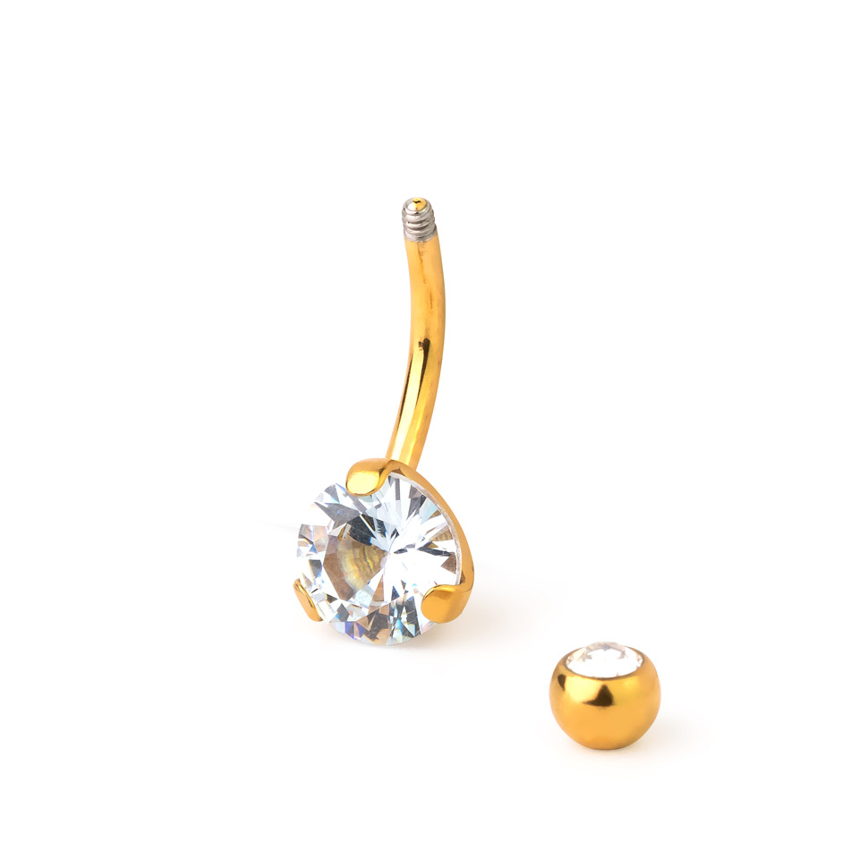 Pozłacany kolczyk do pępka z kamieniem nie jest niczym nowym. Jednak ten model różni się od pozostałych, ponieważ w dolnej części kolczyka cyrkonia utrzymywana jest za pomocą 3 pazurków, co czyni ten kamień większym niż w rzeczywistości.