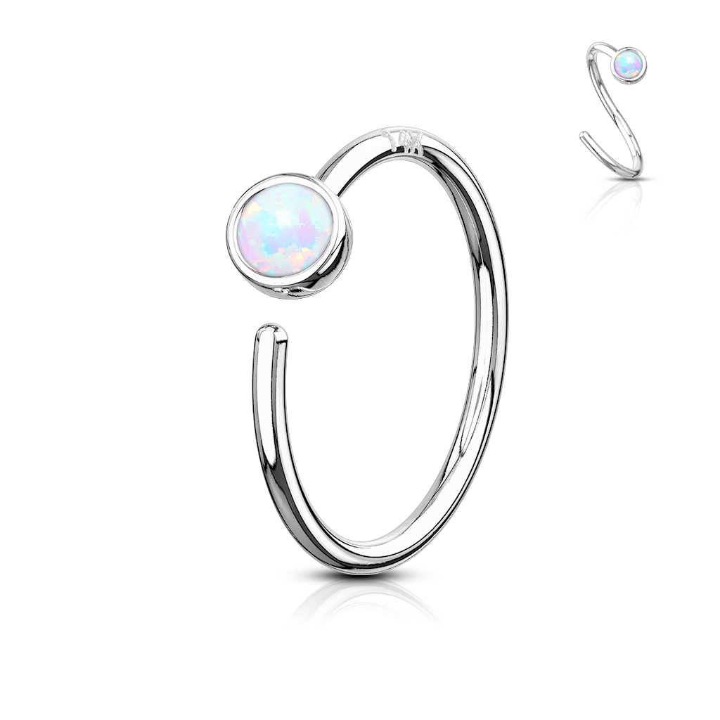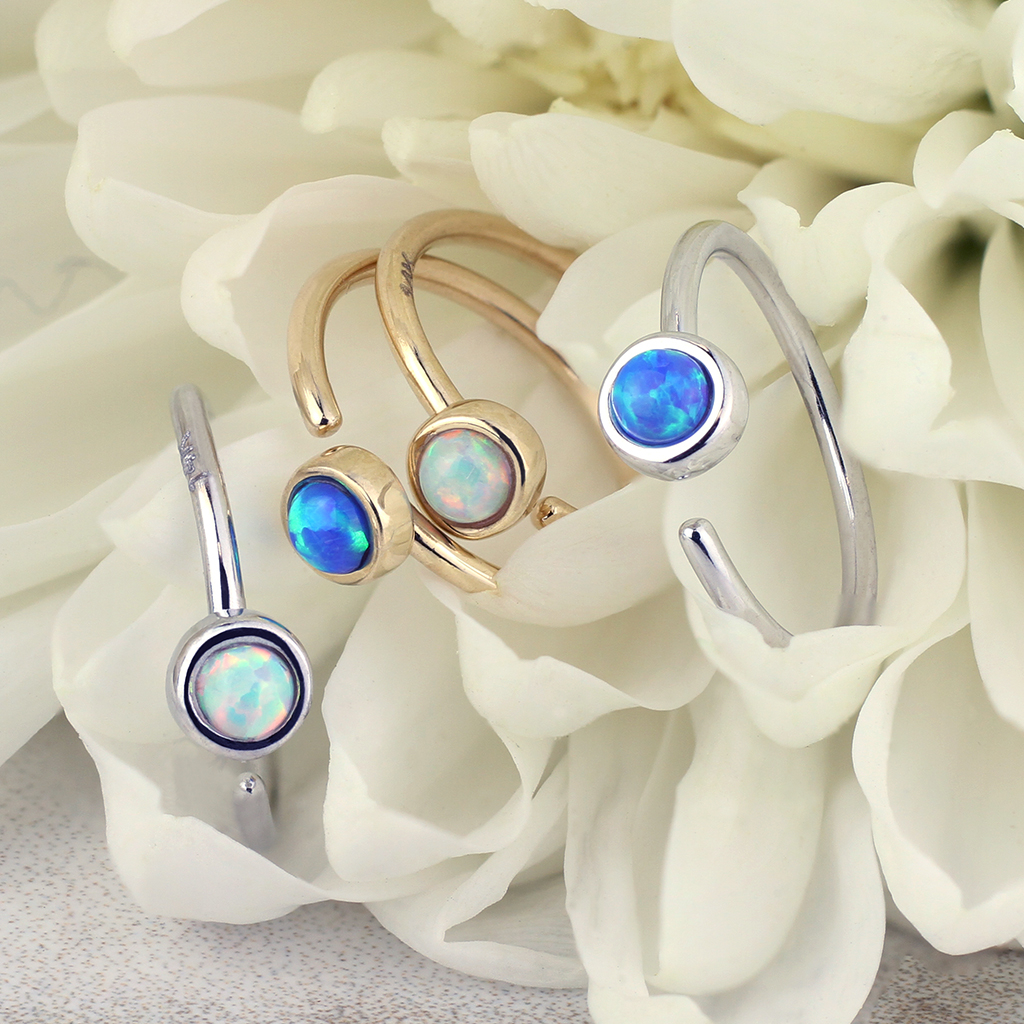 Na pierścieniu znajduje urokliwy opalowy kamień. Jest to w rzeczywistości syntetyczny opal. Podobnie jak w przypadku wyboru materiału, wybierasz również czy chcesz otrzymać biały opal, czy niebieski opal. Biały opal ma odcienie od czerwonego, żółtego do zielonego, ale cały kamień wydaje się biały. Niebieski przylega do niebieskich odcieni, takich jak jasnoniebieski, turkusowy i granatowy.