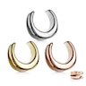 Biżuteria, którą widzisz na zdjęciu trudno sklasyfikować. Nie jest to ani plug, ani tunel ani hanger. Najbardziej przypomina on jednak tunel w kształcie siodła. Na górze jest otwarty, co jest bardzo wygodnie dla tych, którzy chcą go nosić nawet jeśli ich rozpychanie jest większe niż średnica biżuterii. Krawędź tunelu zwija się w dół, więc będzie on bezpiecznie umieszczony w uchu i nie wypadnie, nawet jeśli twój otwór jest większy niż on sam.