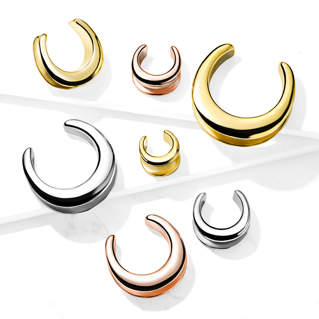Biżuteria, którą widzisz na zdjęciu trudno sklasyfikować. Nie jest to ani plug, ani tunel ani hanger. Najbardziej przypomina on jednak tunel w kształcie siodła. Na górze jest otwarty, co jest bardzo wygodnie dla tych, którzy chcą go nosić nawet jeśli ich rozpychanie jest większe niż średnica biżuterii. Krawędź tunelu zwija się w dół, więc będzie on bezpiecznie umieszczony w uchu i nie wypadnie, nawet jeśli twój otwór jest większy niż on sam.