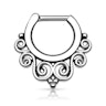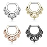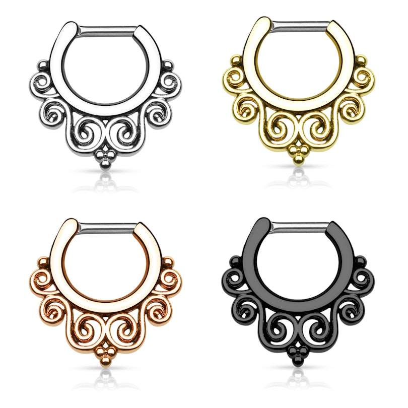 Udekoruj swoje przekłucie septum tym ślicznym kolczykiem z motywem ślimaków i zawijasów, które w prosty sposób zamkniesz tylko jednym kliknięciem. Wzory mają formę skrętów, które tworzą ładną symetrię, a w dolnej części krawędzi widać trzy małe kulki niczym perełki, które dopełniają projekt.