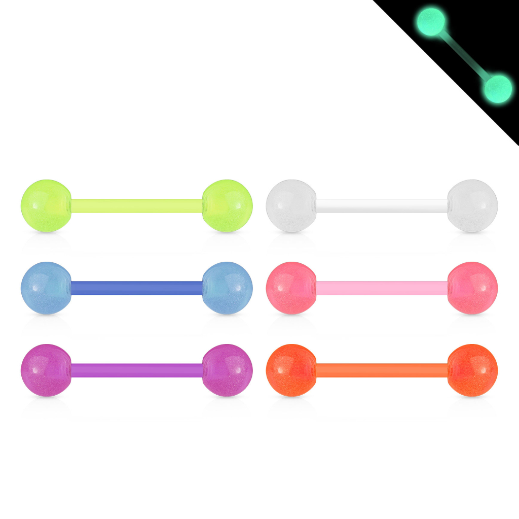 Prezentujemy ten świetny kolczyk do języka, który świeci w ciemności. Wybierz jeden z sześciu kolorów, które odnajdziesz obok zdjęcia. Ten model jest wykonany z akrylu, miękkiego i elastycznego materiału, który jest bezpieczny dla zębów oraz dziąseł i ochroni je przed ewentualnymi urazami.