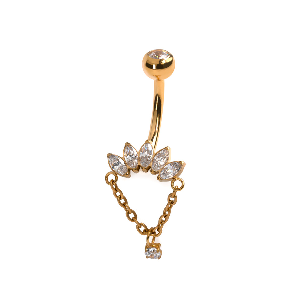 Ten tytanowy kolczyk do pępka zdobiony jest kamieniami o szlifie markizy oraz łańcuszkiem, i zdecydowanie nie jest kolejną sztangą. To biżuteria z charakterem. Kamienie o szlifie markizy, przypominają małą koronę, podczas gdy łańcuszek dodaje nieco dramatyzmu (bo Twój piercing zasługuje być zauważonym).