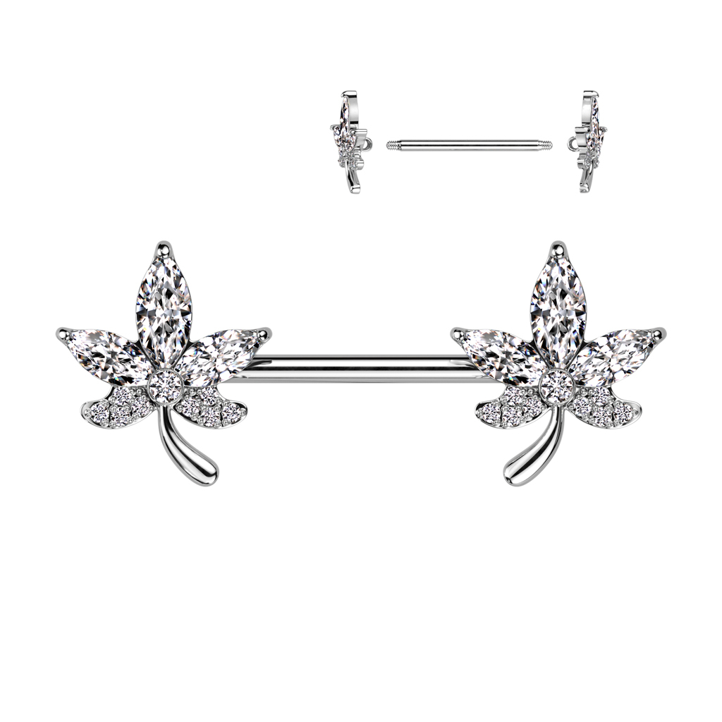 Ta biżuteria to nic innego jak błyszcząca sztanga do sutka z listkami, które są zdobione mieniącymi się kamieniami. Największe skierowane ku górze mają duże kamienie, a dwa dolne listki wypełnione są drobnymi cyrkoniami. Wszystkie liście otaczają centralny kamień w środku.