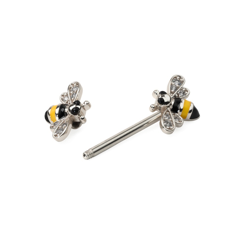 Jeśli szukasz oryginalnych wzorów do piercingu sutka, to mamy dla Ciebie tą śliczną propozycję biżuterii. Składa się ona z prostej sztangi o długości 14 mm, ale rzeczywisty rozmiar może się różnić, wszystko zależy ile miejsca zostawisz pomiędzy pszczółkami.