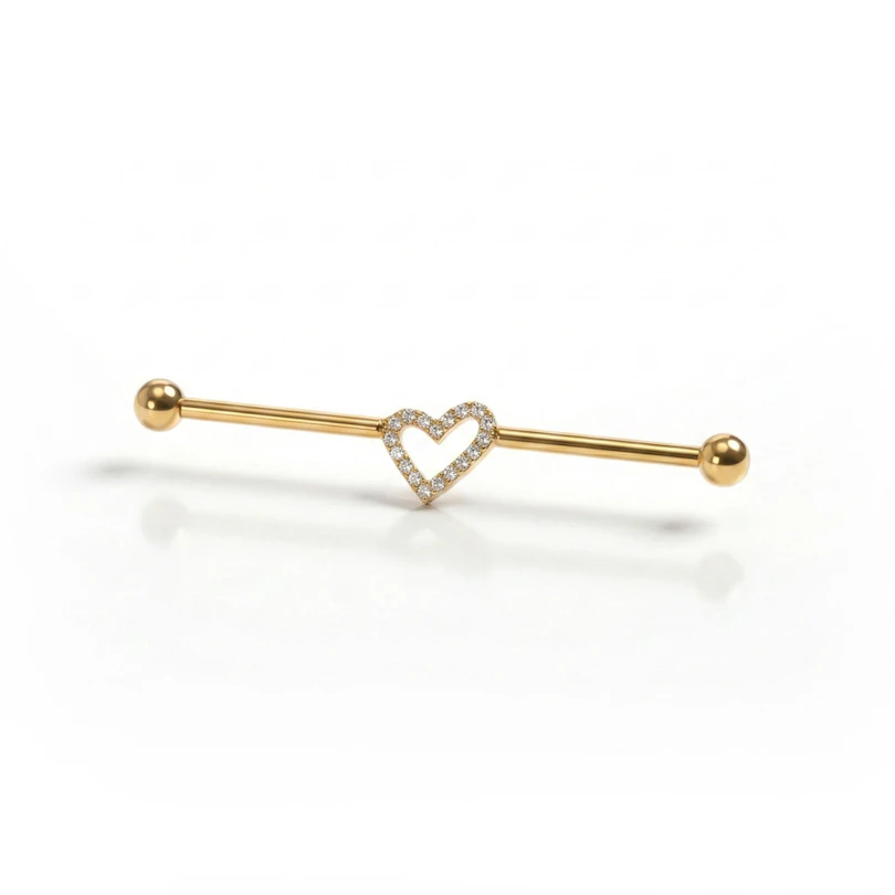 Industrialna sztanga z centralnym serduszkiem z tytanu wprowadza delikatniejszy akcent do klasycznej formy. Serduszko znajduje się na środku, obrysowane drobnymi kamyczkami w starannej oprawie pazurkowej, co dodaje biżuterii detalu bez przytłoczenia. Dostępna w złotym i srebrnym wykończeniu, skupia uwagę na środku, a sama sztanga pozostaje czysta i wyważona.