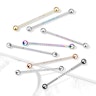 Jeśli jesteś właścicielem piercingu industrial w uchu, mamy dla Ciebie świetną biżuterię. Składa się z prostej sztangi, zakończonej dwoma kulkami, po jednej na każdym końcu. Na środku sztangi widać wygrawerowaną część z ośmioma małymi kamieniami, które ułożone są z perfekcyjną precyzją. Sztanga jest wykonana ze stali chirurgicznej i dostępna w różnych kolorach, oraz zdobiona różnymi kolorami kamieni. Jakkolwiek, jedynie błyszcząca, srebrna sztanga jest dostępna z różnymi kolorami kamieni. Innymi słowy, kolorowe sztangi są zdobione tylko przezroczystymi kamieniami.