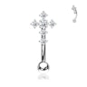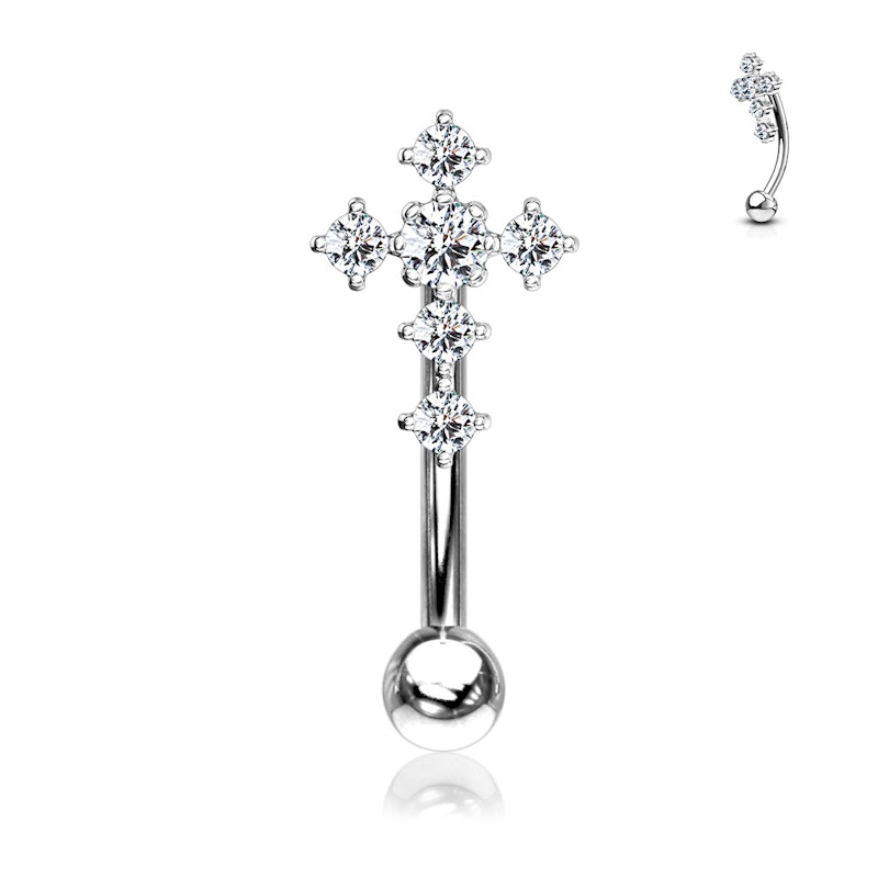 Ten zakrzywiony kolczyk jest wykonany ze stali chirurgicznej i dostępny w trzech różnych kolorach. Srebrny model jest pokryty warstwą rodu, natomiast złote modele 14 karatowym złotem. Wszystkie różnią się między sobą wyłącznie kolorem, gdyż krzyżyk pozostanie identyczny w każdym z nich. Krzyż tworzą trzy kamienie na górze, dwa na dole, oraz jeden większy w centralnej części. Wszystkie mają okrągły kształt i są zablokowane małymi ramionami.