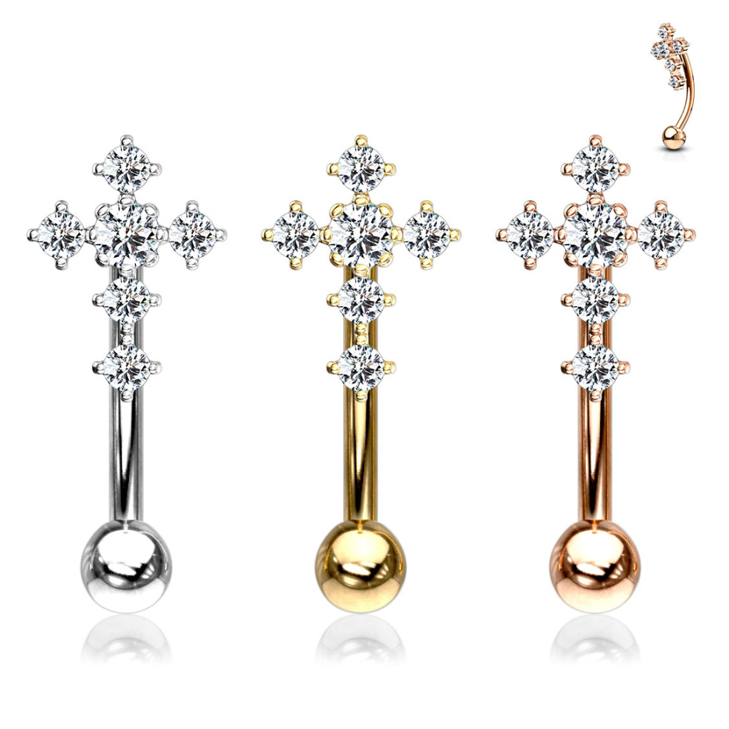 Ten zakrzywiony kolczyk jest wykonany ze stali chirurgicznej i dostępny w trzech różnych kolorach. Srebrny model jest pokryty warstwą rodu, natomiast złote modele 14 karatowym złotem. Wszystkie różnią się między sobą wyłącznie kolorem, gdyż krzyżyk pozostanie identyczny w każdym z nich. Krzyż tworzą trzy kamienie na górze, dwa na dole, oraz jeden większy w centralnej części. Wszystkie mają okrągły kształt i są zablokowane małymi ramionami.
