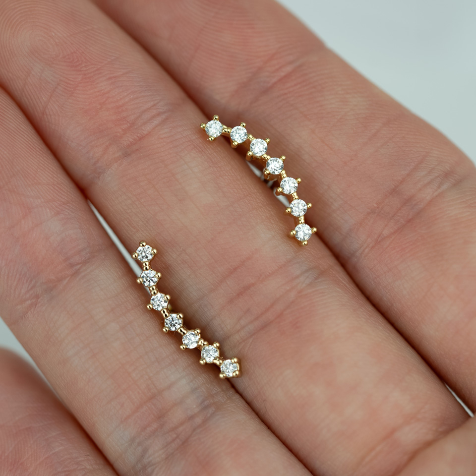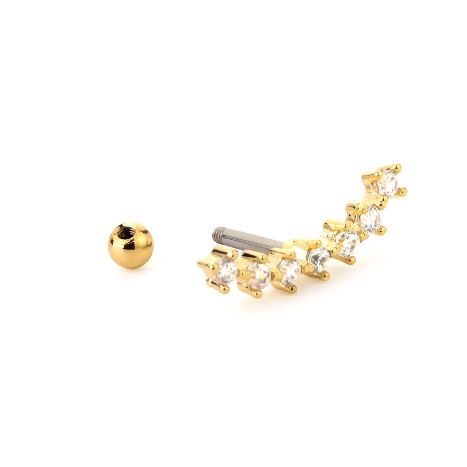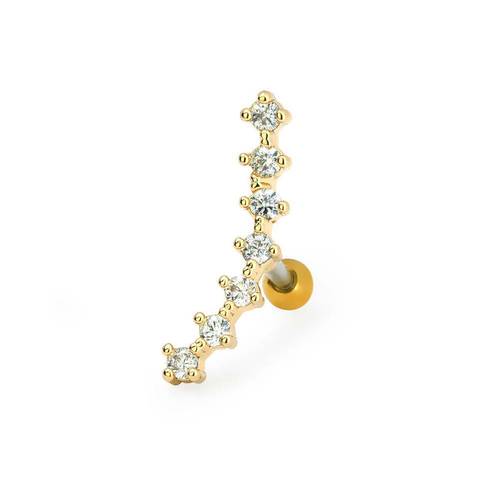 Świetna stylowa biżuteria ucha jest doskonałym uzupełnieniem każdego wyglądu, a jeśli potrzebujesz czegoś bardziej rzucającego się w oczy, ten model jest dla Ciebie. Zakrzywiona sztanga zdobiona kamieniami, mieni się niczym gwiaździste niebo. Ten kolczyk sam w sobie przyciąga uwagę, ale jest też świetnym dodatkiem i można go śmiało łączyć z innymi rodzajami biżuterii. Możesz go nosić w piercingu helix, conch lub płatku ucha. Zmieniaj go jak tylko zechcesz i próbuj różnych kombinacji.