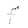 Sztanga, którą widzisz na zdjęciu najlepiej sprawdzi się w piercingu ucha ze względu na swój rozmiar. Pręcik ma 6 mm długości i 1,2 mm grubości. Przednia i tylna kulka mają około 4 mm. Ta pierwsza zdobiona jest małym, przezroczystym kamieniem. Pod nią zawieszony jest mały krzyżyk, który będzie podążał za ruchami ciała. Ma on w przybliżeniu 20 mm wysokości oraz 12 mm szerokości i dostępny jest w trzech kolorach. Wybrany kolor pokrywa całą biżuterię, zatem jeśli wybierzesz czarny, zarówno krzyżyk, pręcik i kulki będą czarne. Jednym elementem wspólnym dla wszystkich modeli jest przezroczysty kamień.