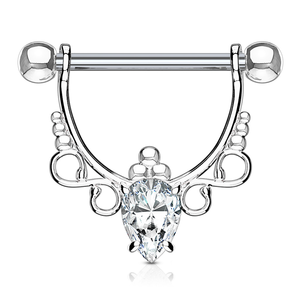 Ta biżuteria do sutka dostępna jest w srebrnym i złotym kolorze i wersji różowego złota, wszystkie zdobione przezroczystą cyrkonią. Złote warianty są powleczone warstwą 14k złota, a srebrny model pokryty rodem, co nadaje mu extra luksusu.