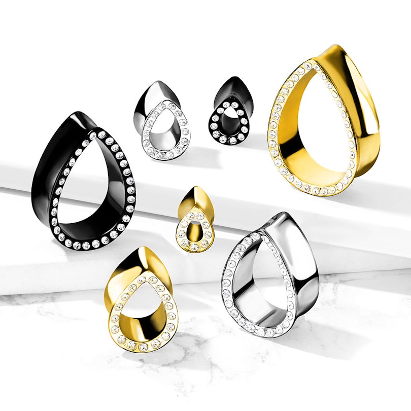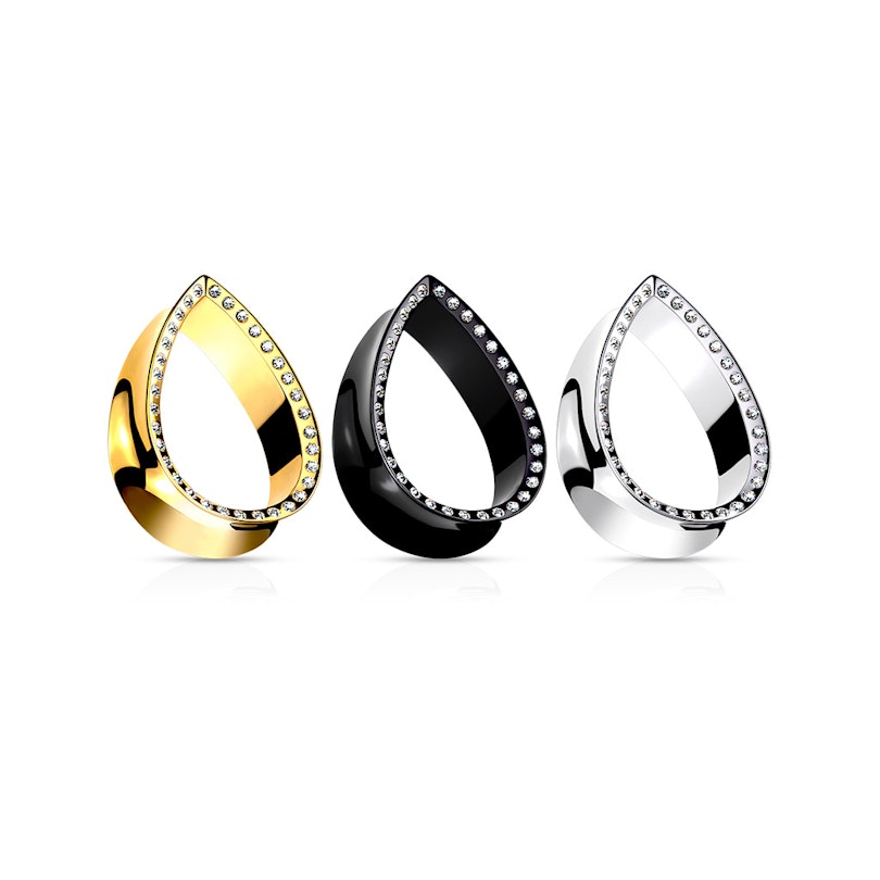 Większość tuneli jest okrągła. Ten model ma kształt łzy -- lub gruszki jak wolisz. Dostępny w trzech pięknych kolorach, które odnajdziesz na zdjęciu. Wspólna cechą wszyskich tuneli jest to, iż są zdobione małymi, przezroczystymi kamieniami wokół krawędzi. In większa średnica, tym więcej kamieni wokół krawędzi.