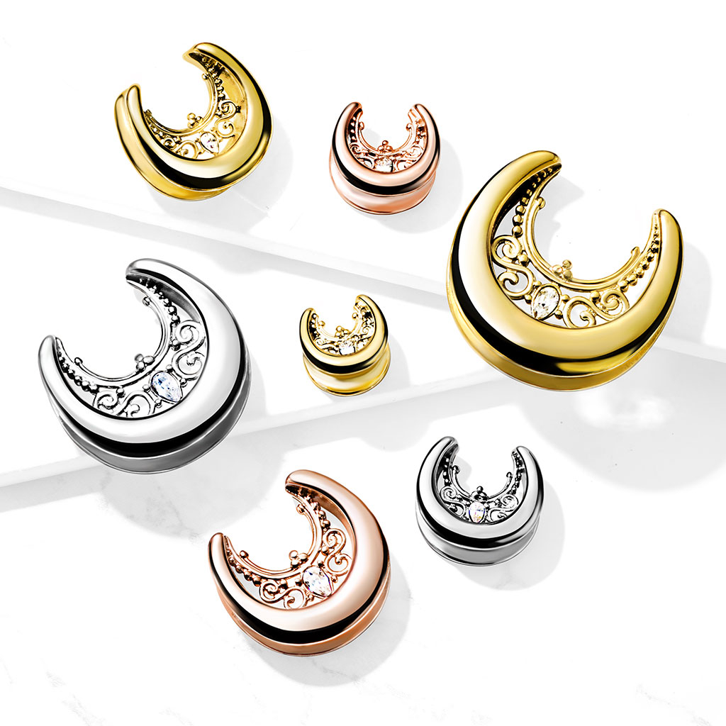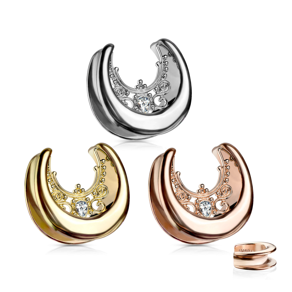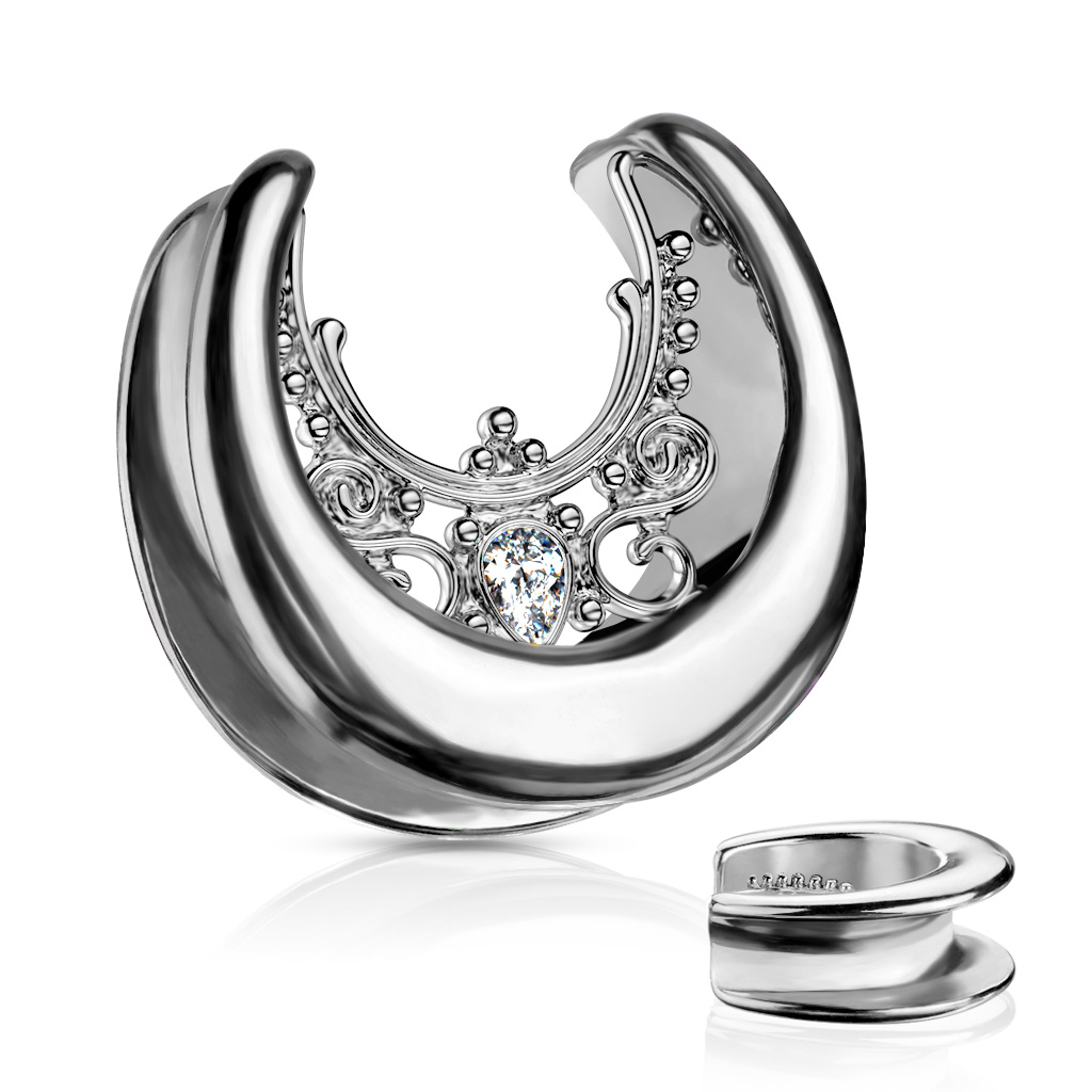 Ten tunel jest inny niż klasyczne modele, gdyż ma formę siodła i jest na górze otwarty. Dzięki swojej konstrukcji będzie bezpiecznie utrzymywany w otworze ucha. Pośrodku zdobi go filigranowy wzór, który tworzą małe zawijasy i kulki, co wygląda z daleka jak haft. Centralna część zdobiona jest przezroczystym kamieniem w kształcie kropli.