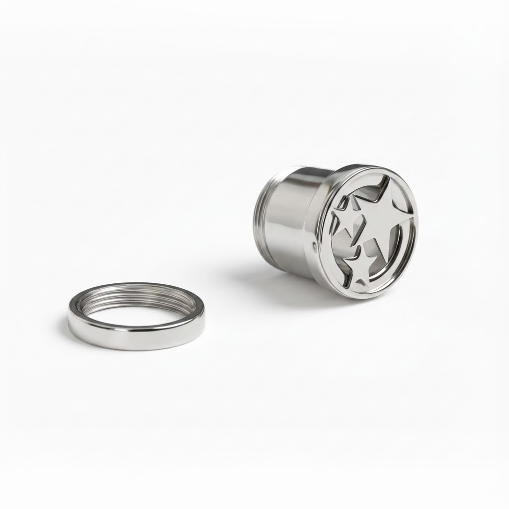 Wykonany ze stali chirurgicznej, jest trwały, wodoodporny i odpowiedni dla większości typów skóry. Zewnętrzny gwint sprawia, że obsługa jest prosta: włóż tunel, przykręć tylną nakrętkę i gotowe.