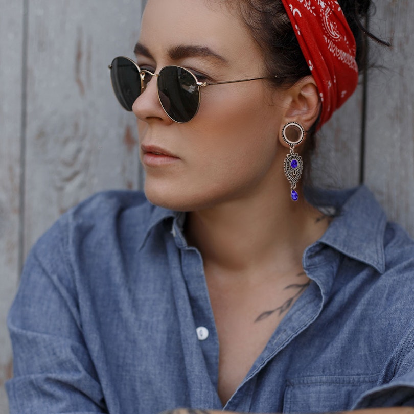 Ten tunel możesz nosić w rozciągniętych przekłuciach o rozmiarach 6 do 16 mm. Jest on wykonany ze stali chirurgicznej, a jego przednia krawędź z mosiądzu, którą tworzą małe kulki. W dolnej części znajduje się zawieszka, która ma formę kropli i zdobią ją także łuki i inne wzory. Pośrodku znajduje się ładny, niebieski kamień, z którego wyłaniają się małe kropelki, niczym oglądanie zachódu słońca na morzu. Drugi kamień doczepiony jest do wisiorka za pomocą małego kółka na dole i stanowi ostatnią część zawieszki. Cyrkonia ma formę kropli i taki sam kolor jak ta druga.