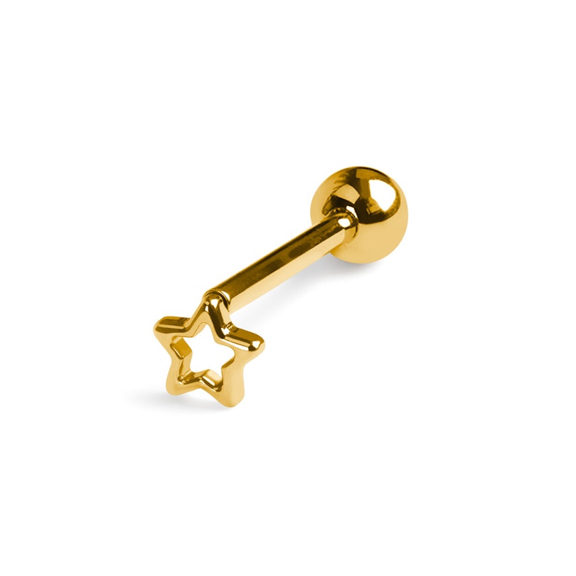 Ta sztanga do języka z tytanu zdobiona jest gwiazdką. Kolczyk jest hipoalergiczny, zatem nadaje się dla osób o wrażliwej skórze. Gwint wewnętrzny pozwala na wprowadzenie gładkiego pręcika w przekłucie, a następnie dokręcenie go na miejscu.