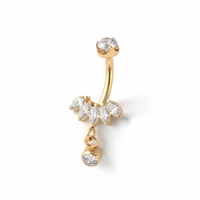 Poznaj swój nowy kolczyk do pępka, który jest nie tylko elegancki, ale też figlarny. Tytanowa sztanga do pępka z kamieniami o szlifie markizy jest hipoalergiczna i wodoodporna (zgadza się, nie rdzewieje i nie powoduje podrażnień).