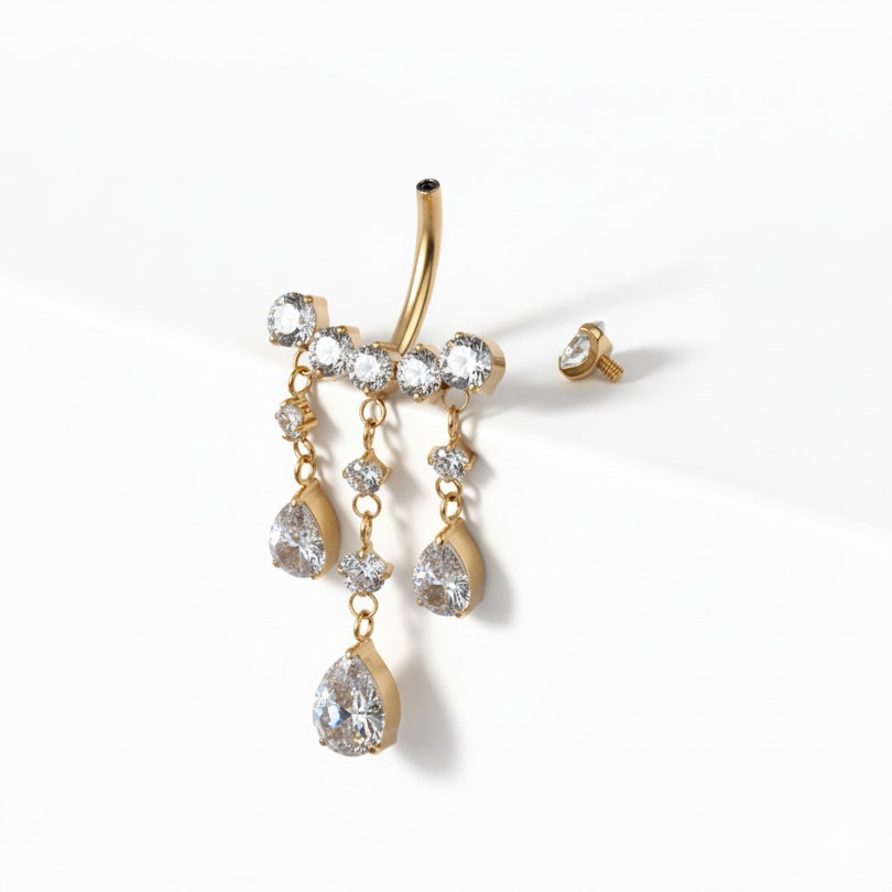 Sztanga do pępka z tytanu z wiszącymi kryształkami została stworzona, żeby się wyróżniać. Kilka kamyczków zwisa w delikatnych kropelkach, tworząc ruch, który podąża za tobą i nadaje całości niepowtarzalny charakter. Pełna detali, ale niezagracona, śmiała, a jednocześnie wyważona. Dostępna w złotej i srebrnej wersji, idealna, gdy chcesz postawić na bardziej dopracowany look.