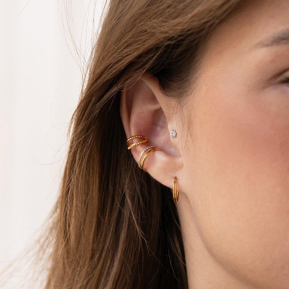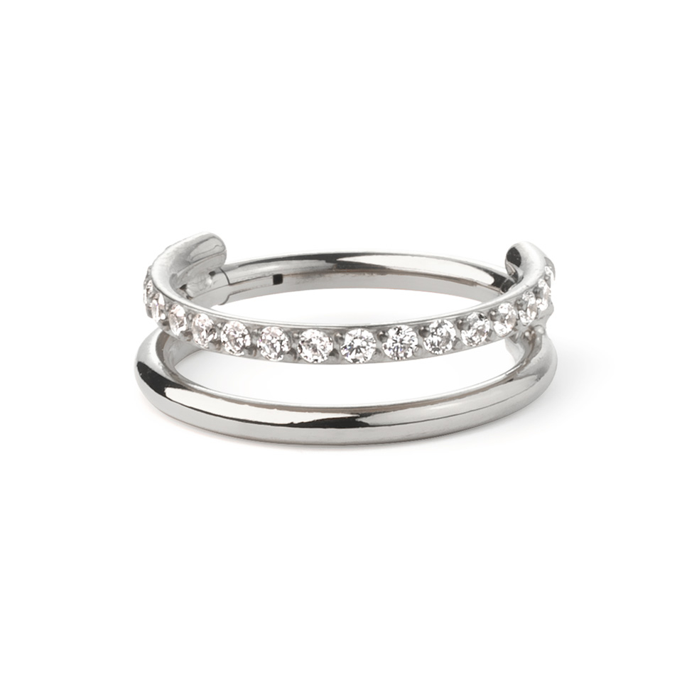 Ten niezwykły kolczyk ma formę dwóch kółek, jeden z rzędem drobnych kamieni szlachetnych, a drugi bez. Oba połączone są gwintem, który wchodzi do piercingu. Biżuteria wykonana jest z tytanu, który jest hipoalergiczny i trwały. Dostępny w różnych średnicach i do wyboru w srebrnej lub złotej wersji. Sprawdzi się doskonale w różnych piercingach ucha i będzie efektownym dodatkiem, gdziekolwiek zdecydujesz się go nosić.