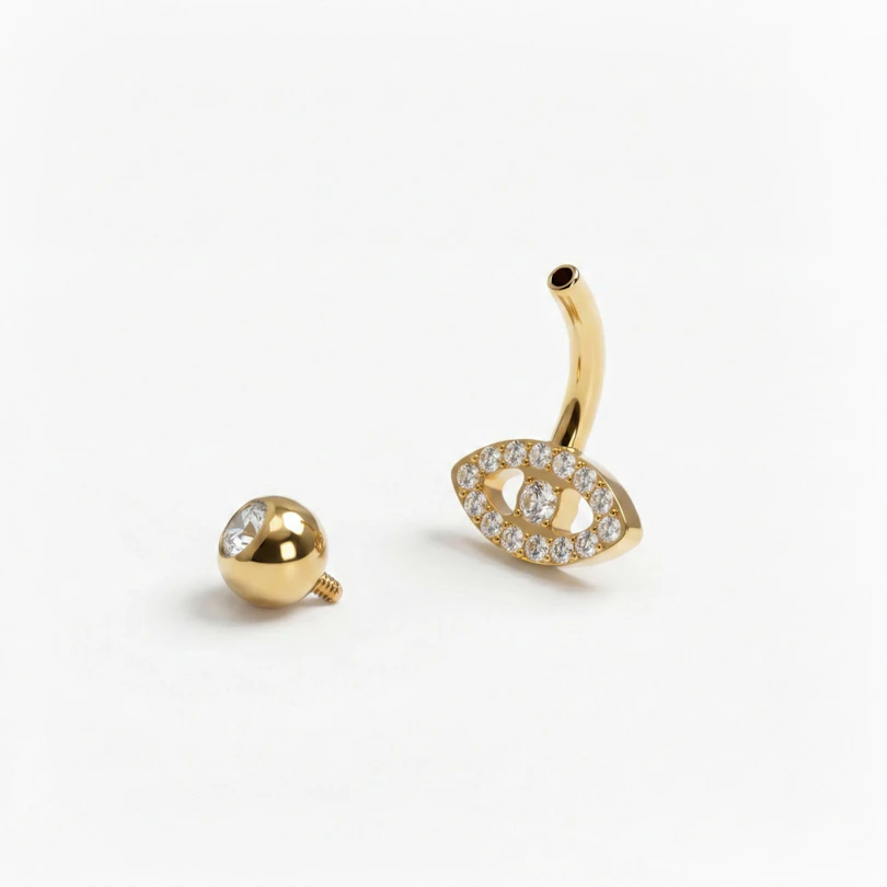 Kolczyk do pępka z tytanu z okiem proroka dodaje symbolicznego charakteru twojemu pępkowi. Motyw oka umieszczony jest na środku, otoczony drobnymi kamyczkami, które podkreślają jego kształt. Ma cichy, ale wyrazisty klimat, łatwo się go nosi i sprawdza się tak samo na dni chillout, jak i wtedy, gdy masz ochotę na bardziej dopracowany styl. Dostępny w odcieniach złota i srebra.