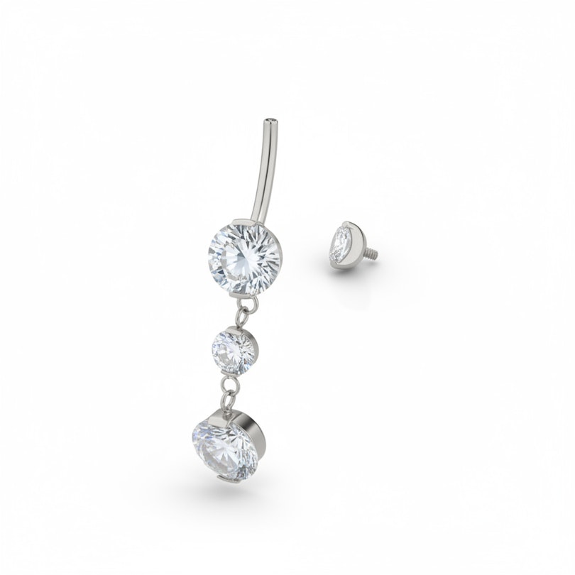 Ten imponujący kolczyk do pępka z tytanu prezentuje 4 oprawione kamienie, po jednym w każdej kulce i dwa w zawieszce. Całkowita długość dolnej części - od górnej części dolnej kulki do dolnej części zawieszki wynosi nieco ponad 3 cm. Kolczyk ma zapięcie z gwintem wewnętrznym, co oznacza, że tylko wkładany pręt przechodzi przez przekłucie, a górny top jest bezpiecznie przykręcany. Tytan to hipoalergiczny i wodoodporny materiał, co sprawia, że świetnie nadaje się na basen.