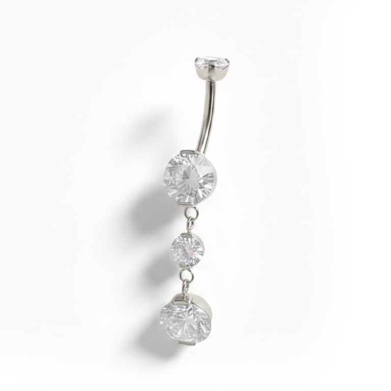 Ten imponujący kolczyk do pępka z tytanu prezentuje 4 oprawione kamienie, po jednym w każdej kulce i dwa w zawieszce. Całkowita długość dolnej części - od górnej części dolnej kulki do dolnej części zawieszki wynosi nieco ponad 3 cm. Kolczyk ma zapięcie z gwintem wewnętrznym, co oznacza, że tylko wkładany pręt przechodzi przez przekłucie, a górny top jest bezpiecznie przykręcany. Tytan to hipoalergiczny i wodoodporny materiał, co sprawia, że świetnie nadaje się na basen.
