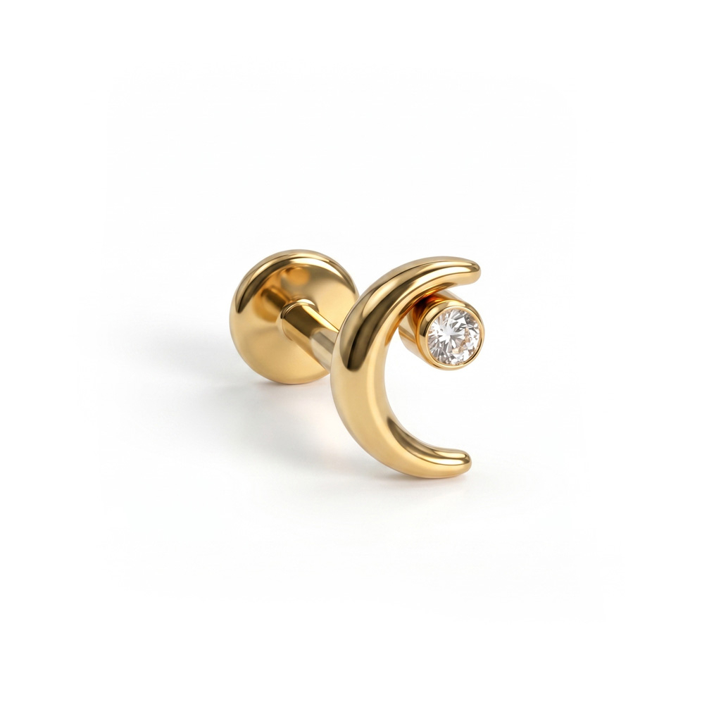 Kolczyk labret z księżycem i gwiazdką z tytanu łączy oba kształty w jedną małą, wygiętą formę. Księżyc układa się blisko skóry, a niewielki kamień osadzony w środku symbolizuje gwiazdkę, tworząc kompaktowy detal. Łatwo wpasowuje się w różne sety, a jednocześnie wyróżnia się swoim charakterem. Dostępny w kolorze złotym i srebrnym.