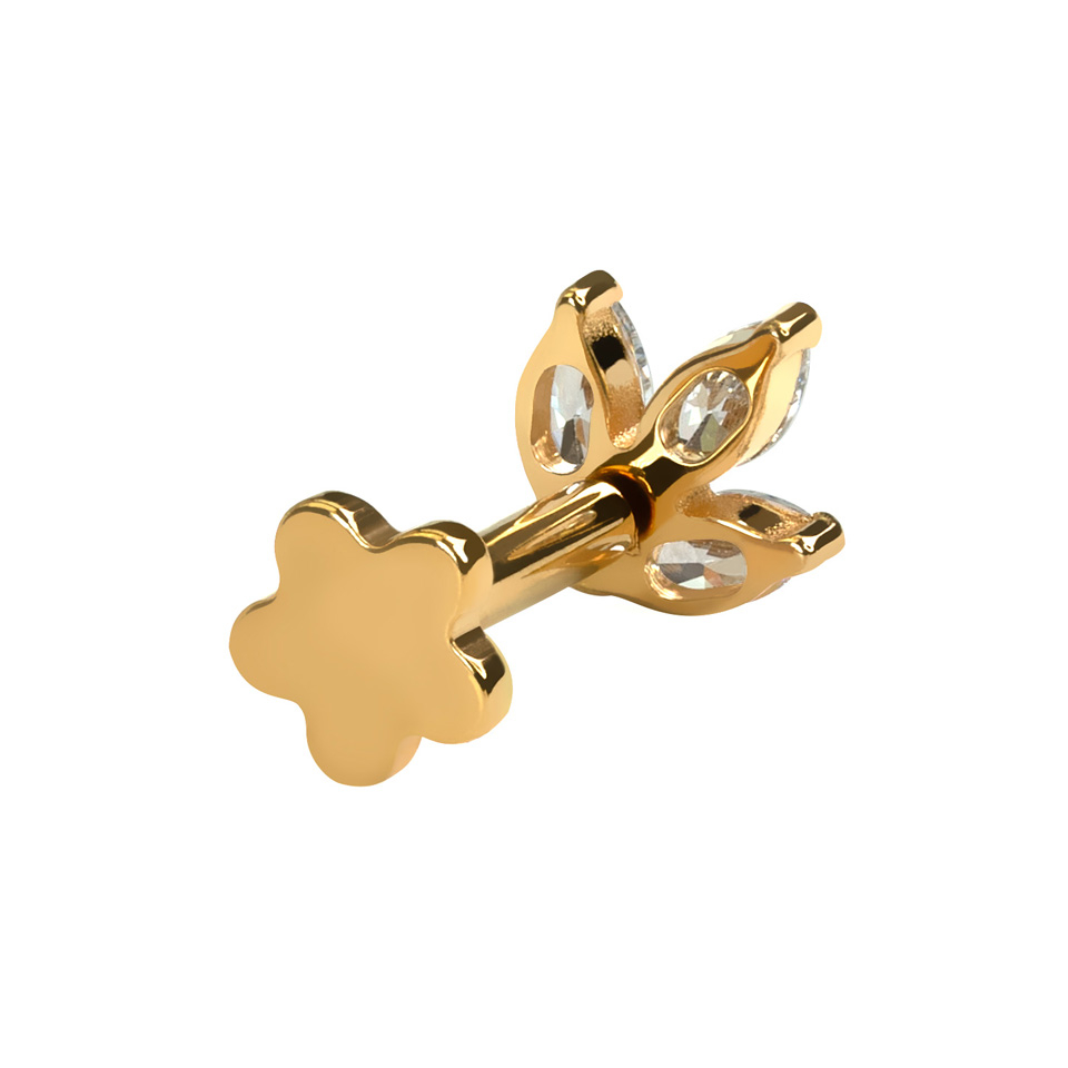 Dwustronny labret w formie liścia z przodu, zdobionego 3 kamieniami o szlifie markizy, oraz tył kolczyka w formie płaskiego kwiatu. Idealna biżuteria do noszenia w przekłuciach, gdzie tył jest widoczny.