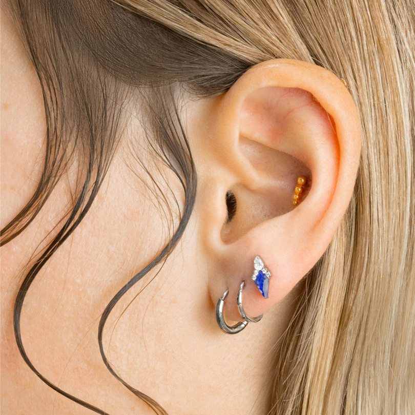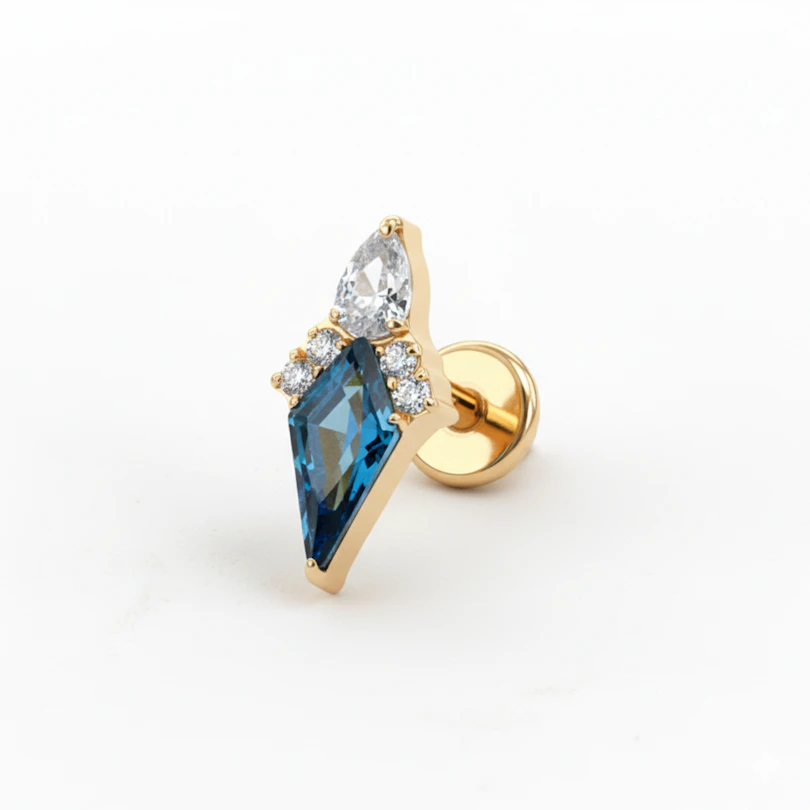 Labret w kształcie diamentu z niebieskim kamieniem w tytanie to połączenie geometrii i charakteru. Ramka w kształcie diamentu utrzymuje efektowny kamień na miejscu za pomocą małych szpilek, które zapewniają mu stabilność. Oferowany w złotej lub srebrnej wersji, został zaprojektowany tak, aby wyróżniać się bez dodatkowych akcesoriów.