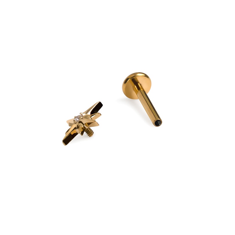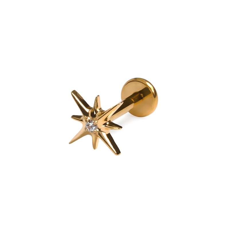 Tytanowy labret z gwiazdką i centralnym kamieniem został stworzony dla tych, którzy lubią biżuterię z odrobiną kosmicznego klimatu. Jego wzór w kształcie gwiazdy otacza centralny kamień. Oferowany w złotym lub srebrnym wykończeniu, jest wyjątkowym dodatkiem w każdej kompozycji ucha.