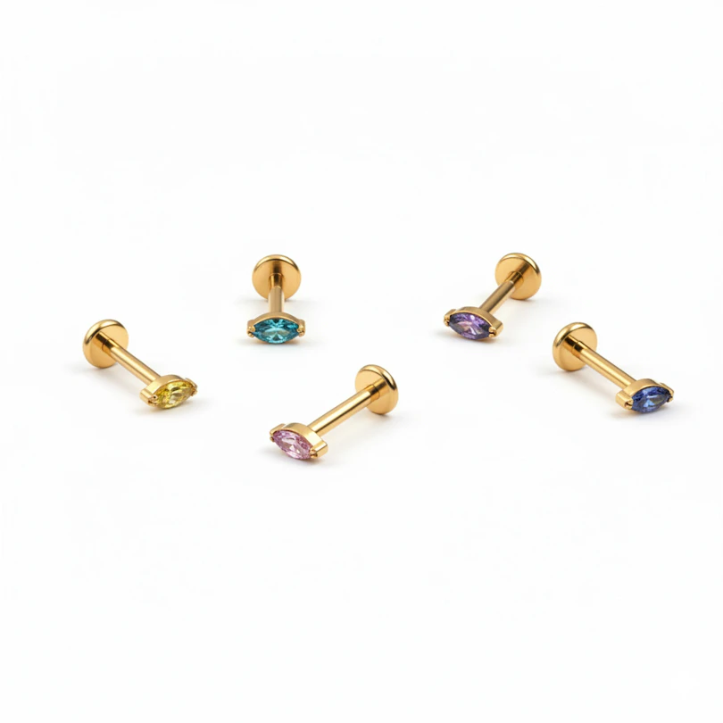 Kamień o szlifie markizowym stanowi elegancki szczegół, który pasuje do każdej kombinacji ucha. Wykonany z tytanu ASTM F136, jest hipoalergiczny, wodoodporny i przy odpowiedniej pielęgnacji przetrwa wieczność. Gwint wewnętrzny nie będzie irytował piercingu i bezpiecznie utrzyma go w piercingu przez cały dzień.