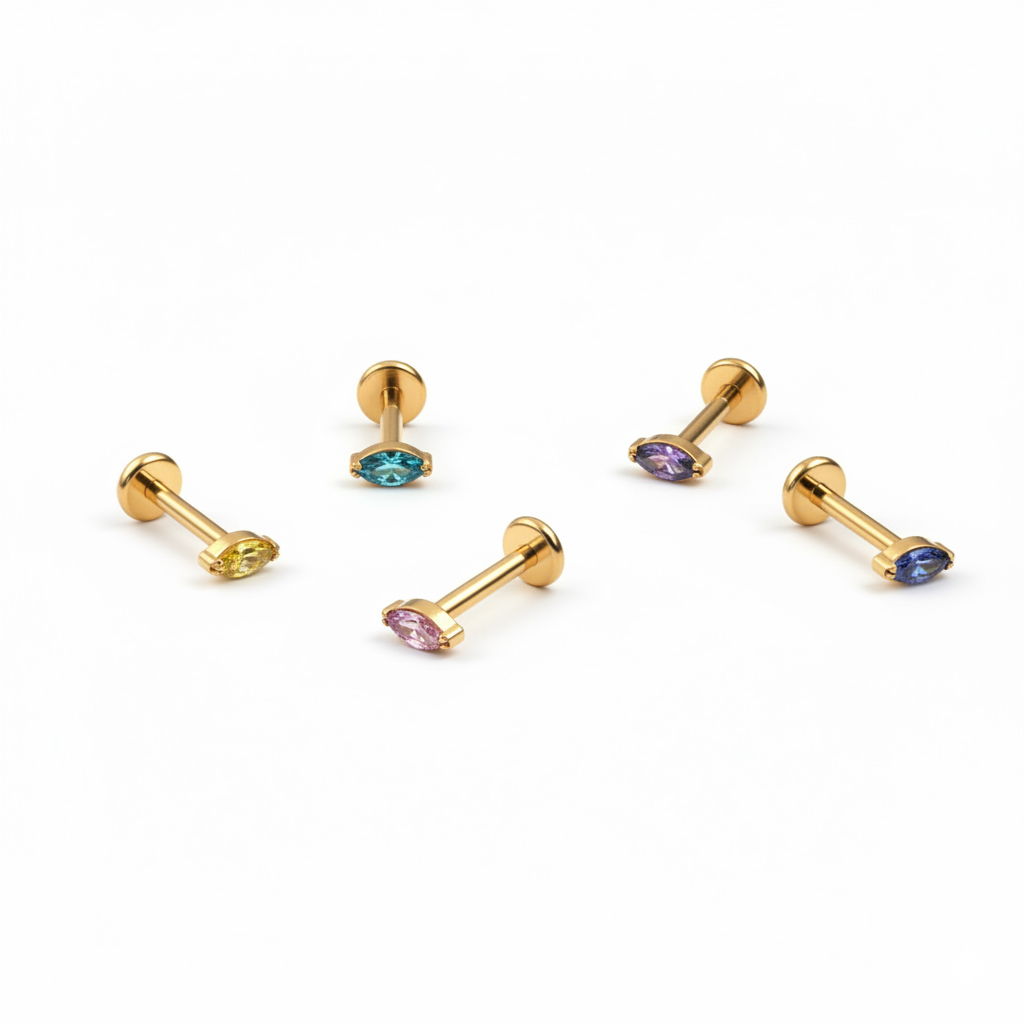 Kamień o szlifie markizowym stanowi elegancki szczegół, który pasuje do każdej kombinacji ucha. Wykonany z tytanu ASTM F136, jest hipoalergiczny, wodoodporny i przy odpowiedniej pielęgnacji przetrwa wieczność. Gwint wewnętrzny nie będzie irytował piercingu i bezpiecznie utrzyma go w piercingu przez cały dzień.