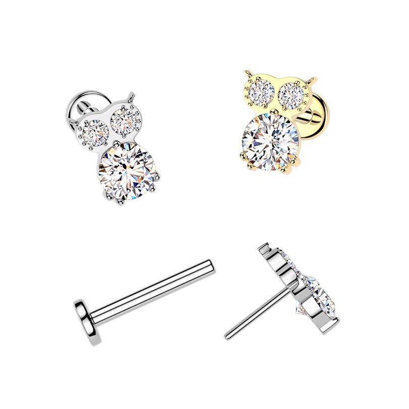 Labret z tytanu ozdobiony kamieniami w kształcie sowy dorzuca trochę charakteru do Twojego stacku na uchu. Sylwetka sowy jest dopracowana, z kilkoma kamieniami osadzonymi w schludnej oprawie z pazurkami, co dodaje projektowi faktury, ale nie przytłacza. Dostępny w złotym i srebrnym kolorze, świetnie sprawdzi się, gdy chcesz coś bardziej kształtnego i wyrazistego niż minimalistycznego.