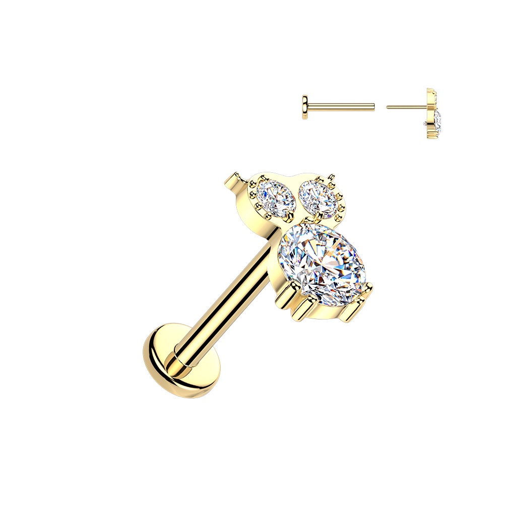 Labret z tytanu ozdobiony kamieniami w kształcie sowy dorzuca trochę charakteru do Twojego stacku na uchu. Sylwetka sowy jest dopracowana, z kilkoma kamieniami osadzonymi w schludnej oprawie z pazurkami, co dodaje projektowi faktury, ale nie przytłacza. Dostępny w złotym i srebrnym kolorze, świetnie sprawdzi się, gdy chcesz coś bardziej kształtnego i wyrazistego niż minimalistycznego.