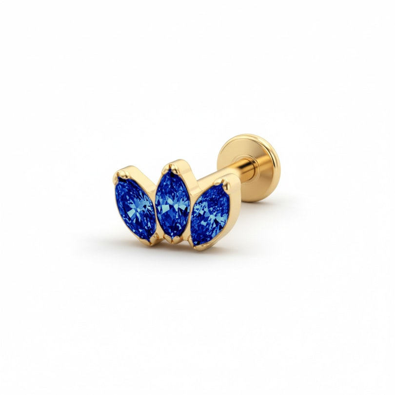 Tytanowy labret z trzema kamieniami w wybranym kolorze udowadnia, że drobne szczegóły potrafią całkowicie zmienić wygląd. Trzy kamienie osadzone w trójramiennej oprawie tworzą koronę, nadając uchu wyjątkowy akcent.