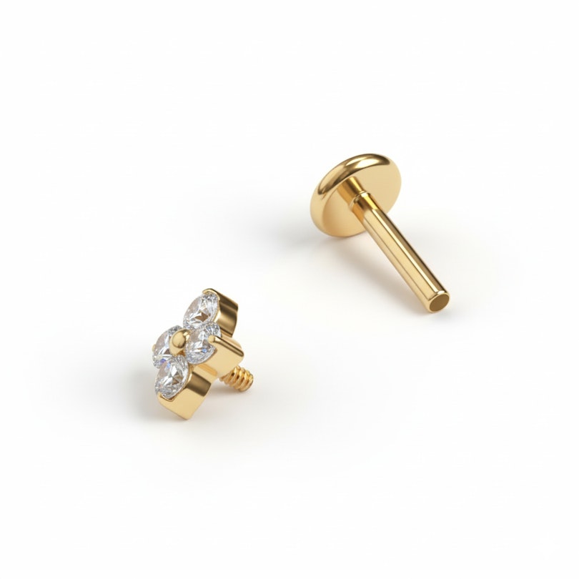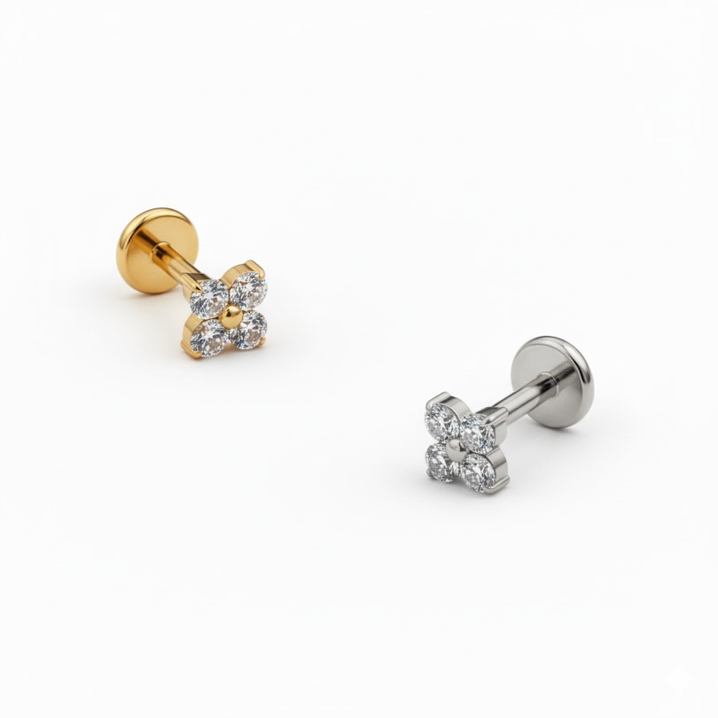 Mini labret z tytanu w kształcie kwiatuszka dodaje delikatny, kwiatowy akcent z małych kamyków ułożonych w formę kwiatu. Osadzone w schludnym oprawieniu na łapkach kamyczki leżą blisko skóry, dając detal bez ciężaru. Dostępny w złotym i srebrnym kolorze oraz w dwóch rozmiarach, mniejszy jest subtelny, większy dodaje więcej charakteru. Noszone razem tworzą łatwą, warstwową stylizację, która wciąż wygląda przemyślanie.
