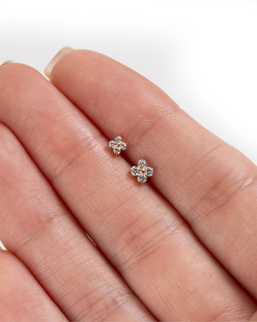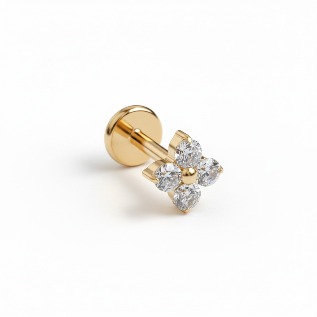 Mini labret z tytanu w kształcie kwiatuszka dodaje delikatny, kwiatowy akcent z małych kamyków ułożonych w formę kwiatu. Osadzone w schludnym oprawieniu na łapkach kamyczki leżą blisko skóry, dając detal bez ciężaru. Dostępny w złotym i srebrnym kolorze oraz w dwóch rozmiarach, mniejszy jest subtelny, większy dodaje więcej charakteru. Noszone razem tworzą łatwą, warstwową stylizację, która wciąż wygląda przemyślanie.