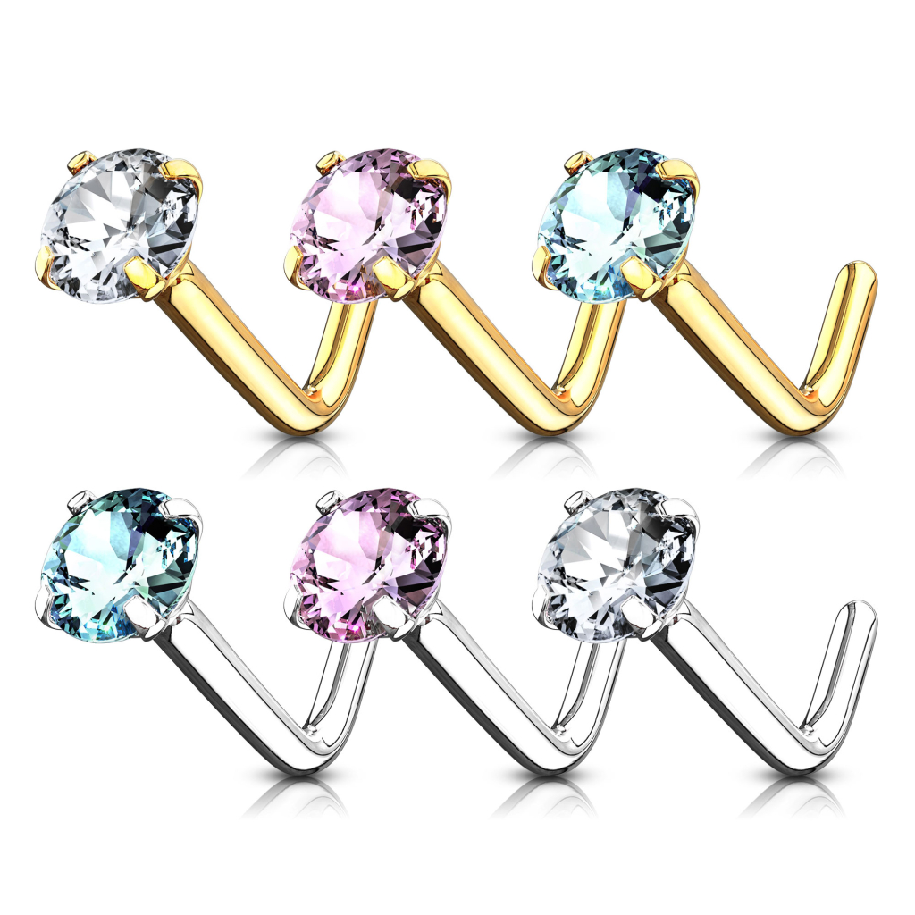 Kolczyk jest zagięty pod kątem prostym, co gwarantuje jego dobre ułożenie wewnątrz nosa, a także nie pozwoli mu wypaść. Jest to sensownie i praktycznie zaprojektoway model, który odróżnia go od prostych kolczyków.