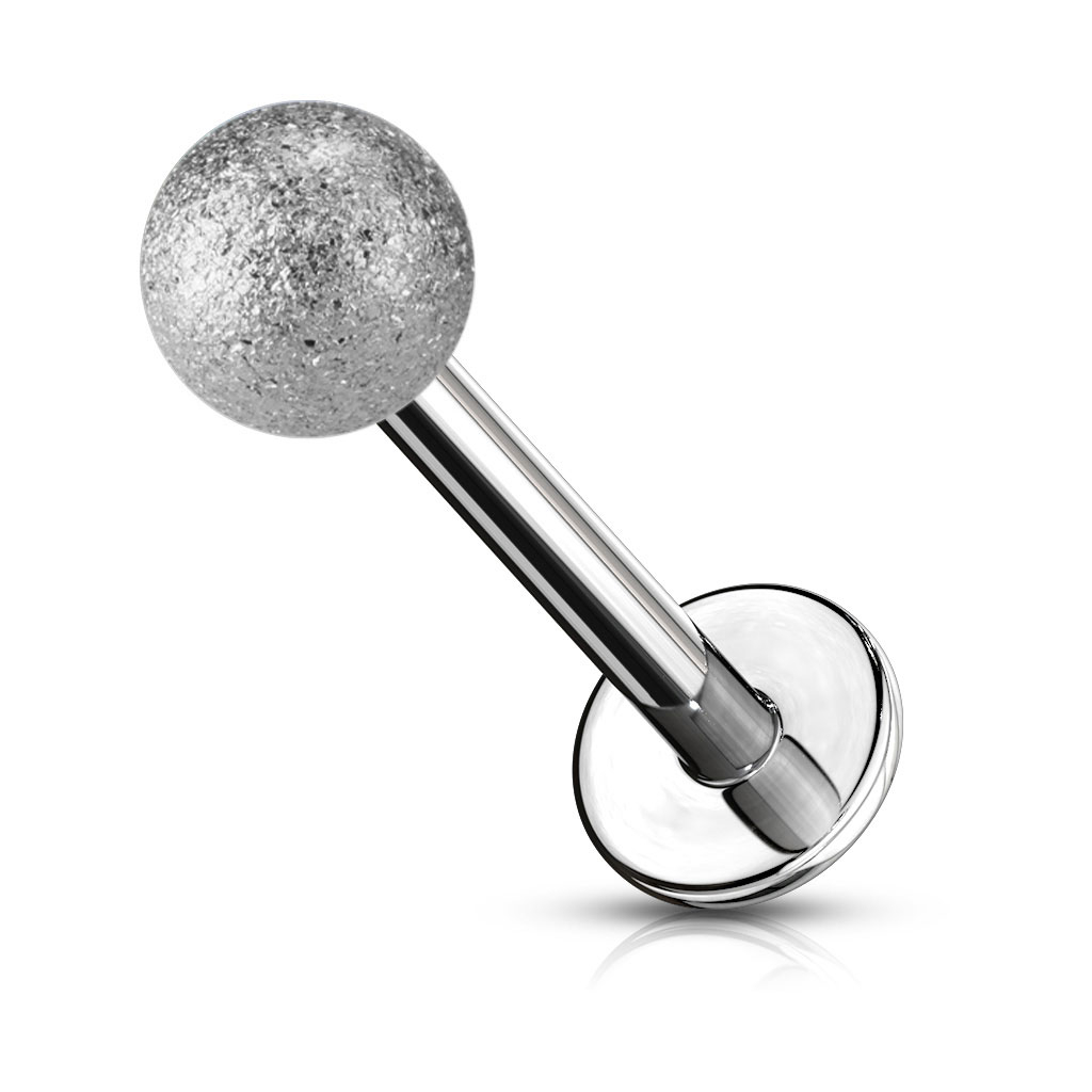 Sam labret zakończony jest kulką ze stali, która powleczona jest specjalną powłoką, która nadaje świecący a zarazem piaskowy wygląd biżuterii.