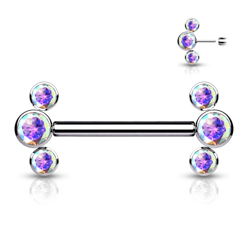 Sztanga jest wykonana z tytanu, jednego z najlepszych materiałów, jaki można nosić w piercingu sutka. Przezroczyste kamienie zdobiące dwa końce biżuterii są wykonane z sześciennych cyrkonii, osadzonych w metalowej części. Większe kamienie mają 3.9 mm, a mniejsze 2.9 mm. Jeśli lubisz inne kolory, sprawdź pozostałe modele.