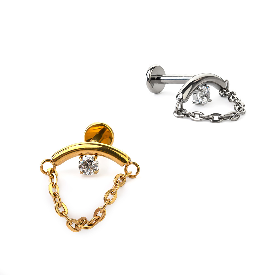 Ten projekt labretu z tytanu ma zakrzywiony pręt z łańcuszkiem, który łączy oba końce i zatacza pętlę pod spodem. Pośrodku pręcika znajduje się centralny kamień w oprawie. Labret ten można nosić poziomo w płatku ucha lub w helixie, gdzie krzywa będzie podążać za kształtem ucha.