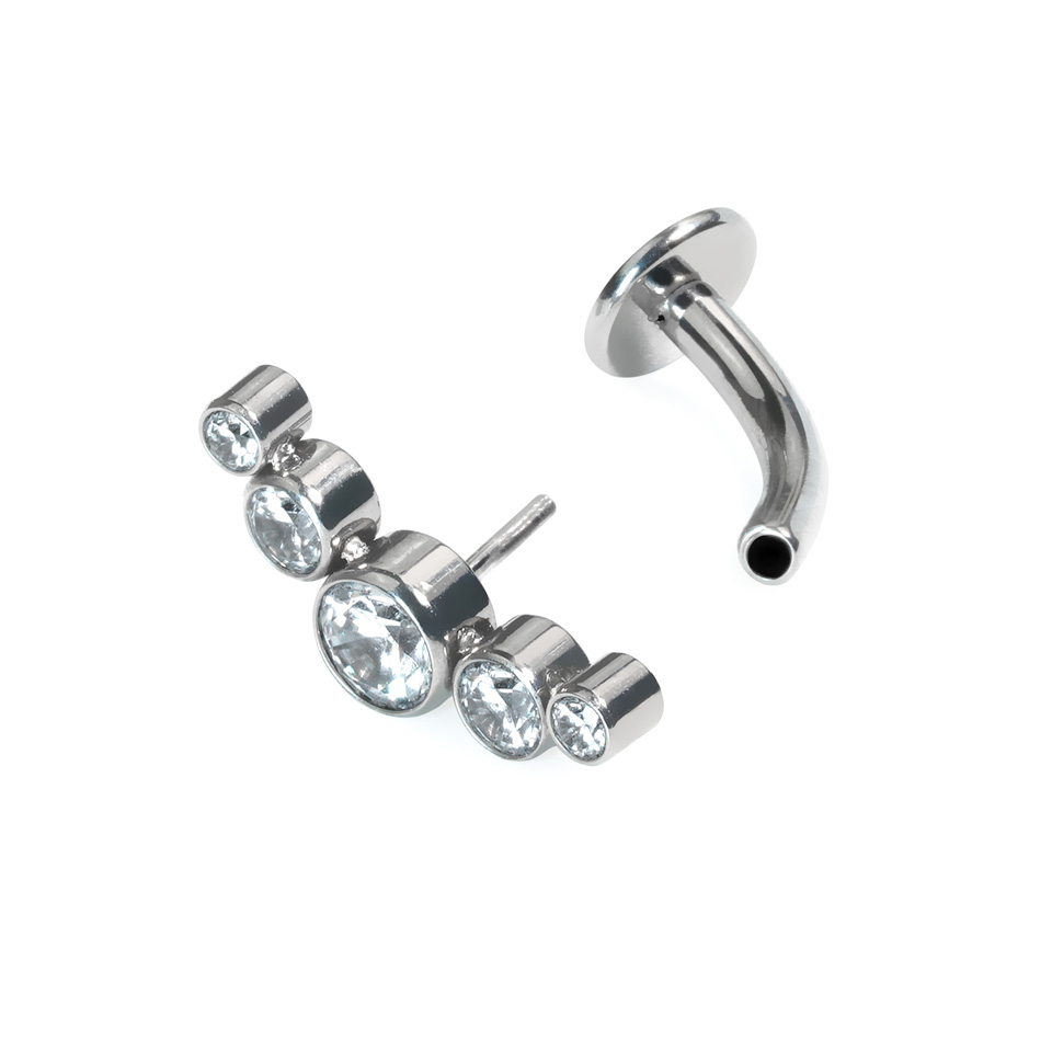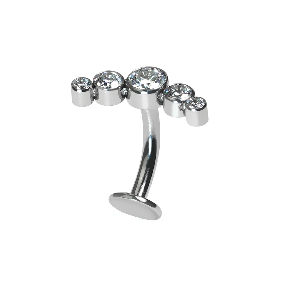 Ten unoszący się kolczyk do pępka zdobiony jest pięcioma kryształkami osadzonymi w oprawie. Wykonany z tytanu jest hipoalergiczny i wodoodporny. Kolczyk zamykany jest wpychanym mechanizmem push-in, co oznacza, że aby go włożyć wystarczy zgiąć lekko pin i włożyć do podstawy labretu.
