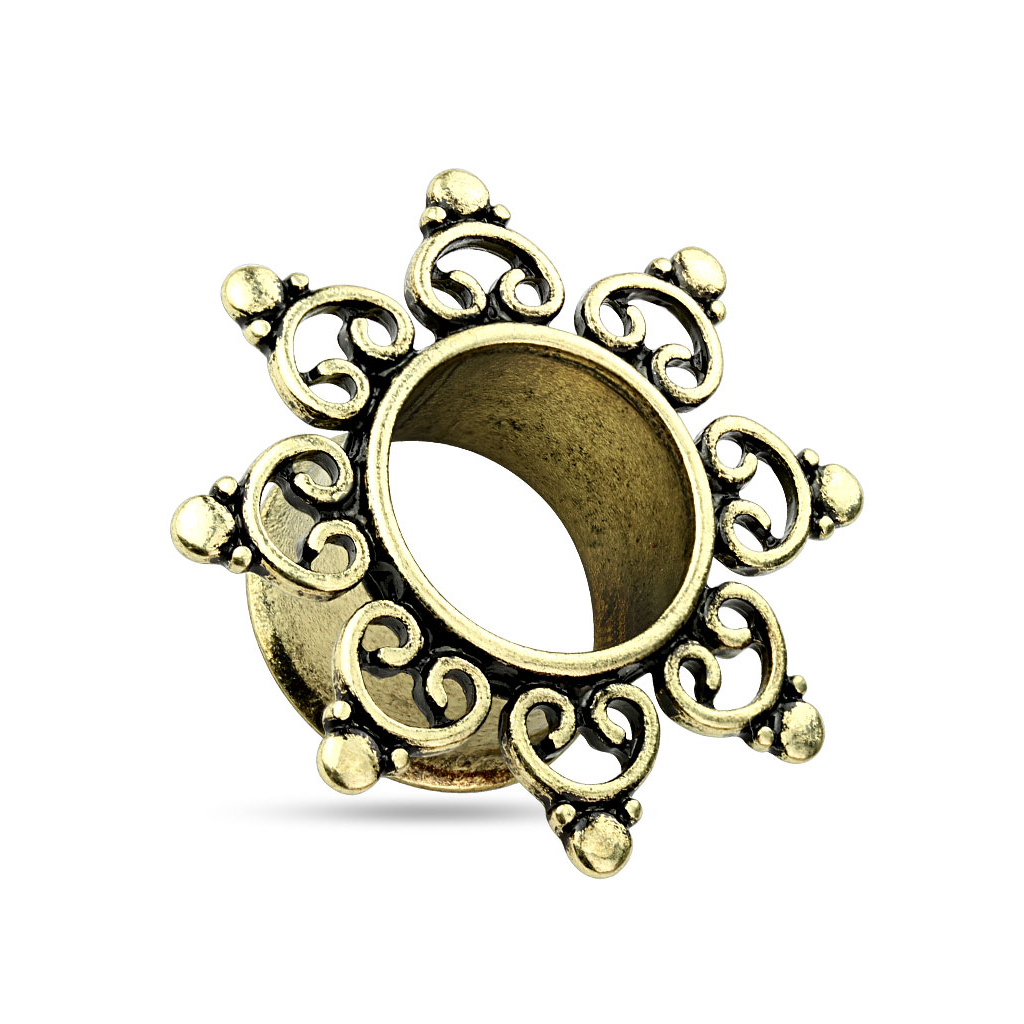 Tunel wykonany jest ze stali chirurgicznej i pokryty złotawym kolorem, który nadaje mu antycznego wyglądu. Tribal wykonany jest natomiast z mosiądzu i doskonale pasuje kolorem do całości.