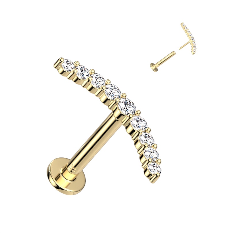 Ten zachwycający labret z 14K złota jest produktem o najwyższej jakości, który zawsze będzie na czasie. Zakrzywiony wzór w formie łuku, wysadzany kamieniami przyciągnie niejedno spojrzenie. Labrety można używać w różnych piercingach, takich jak; ucho, usta i nos. Zakrzywiony wzór tego kolczyka szczególnie sprawdzi się w przekłuciach ucha, gdyż idealnie podąża za jego kształtem.