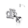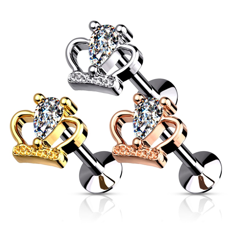 Ten labret zdobiony jest z przodu piękną koroną. Jest ona oferowana w różnych kolorach. Wszystkie modele mają taką samą długość, grubość i kolor kamienia. Na środku korony znajduje się mały, przezroczysty kamień w kształcie odwróconej łzy. Z tyłu korony widać małą nakładkę, którą wciska się w pręcik, co też oznacza że ten model nie ma gwintu do przykręcania. Jeśli zapięcie jest zbyt luźne, spróbuj lekko zagiąć pręcik.