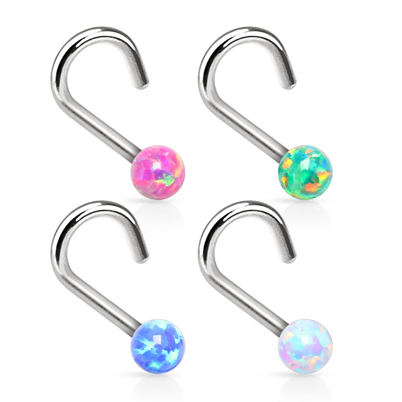 Tylko u nas znajdziesz ten praktyczny i zakręcony kolczyk do nosa, zdobiony opalizującym kamieniem; możesz mieć pewność, że zrobi on dobre wrażenie. Kamień ma wielkość 2 mm i ma kształt małej kuleczki, która dostępna jest w czterech kolorach: białym, różowym, niebieskim i zielonym. Każdy z kamieni jest wyjątkowy, bo nie wygląda tak samo i jest to naturalny dar natury. Mówi się, że opal nadaje inspiracji, wewnętrznego spokoju i miłości. Zatem jeśli sam wygląd nie wystarcza, to istieje wiele innych powodów dla których warto go mieć.
