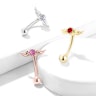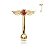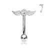 Prezentowany kolczyk na zdjęciu ma zagięty pręcik i nadaje się doskonale do przekłucia brwi. Ma on 8mm długości i 1,2mm grubości, a kulka zamykająca ma 3mm średnicy. Zamiast górnej kulki, kolczyk jest zdobiony parą anielskich skrzydeł, które rozciągają się w dwie strony. Pomiędzy nimi widać śliczny kamień, który różni się kolorem w zależności od modelu jaki wybierzesz.