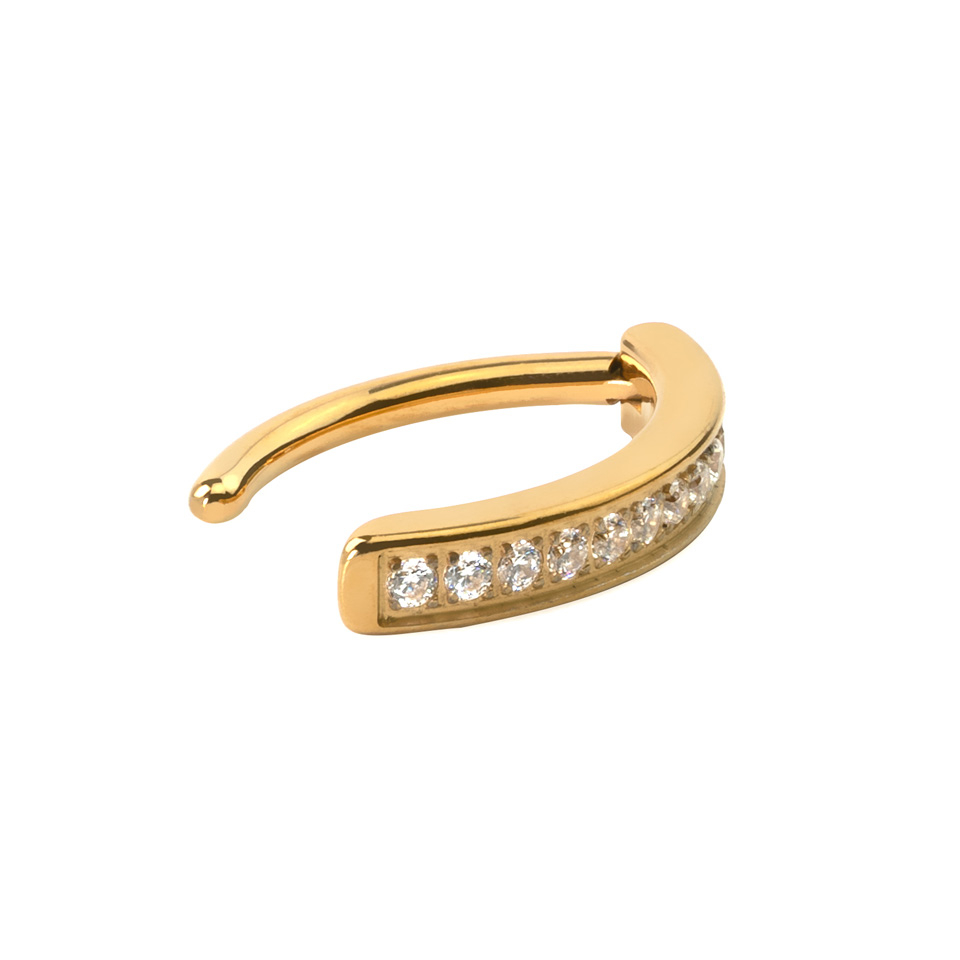 To efektowane kółko clicker do pępka zdobione jest rzędem przezroczystych kamieni, które dodadzą uroku Twojemu stylowi. Lekkie zakrzywienie tego kółka clickera oznacza, że znajduje się ono bliżej ciała niż tradycyjne kółko, dzięki czemu jest bardzo praktyczne w użyciu. Wykonane z tytanu klasy do implantów, co oznacza, że jest hipoalergiczne, lekkie i trwałe.